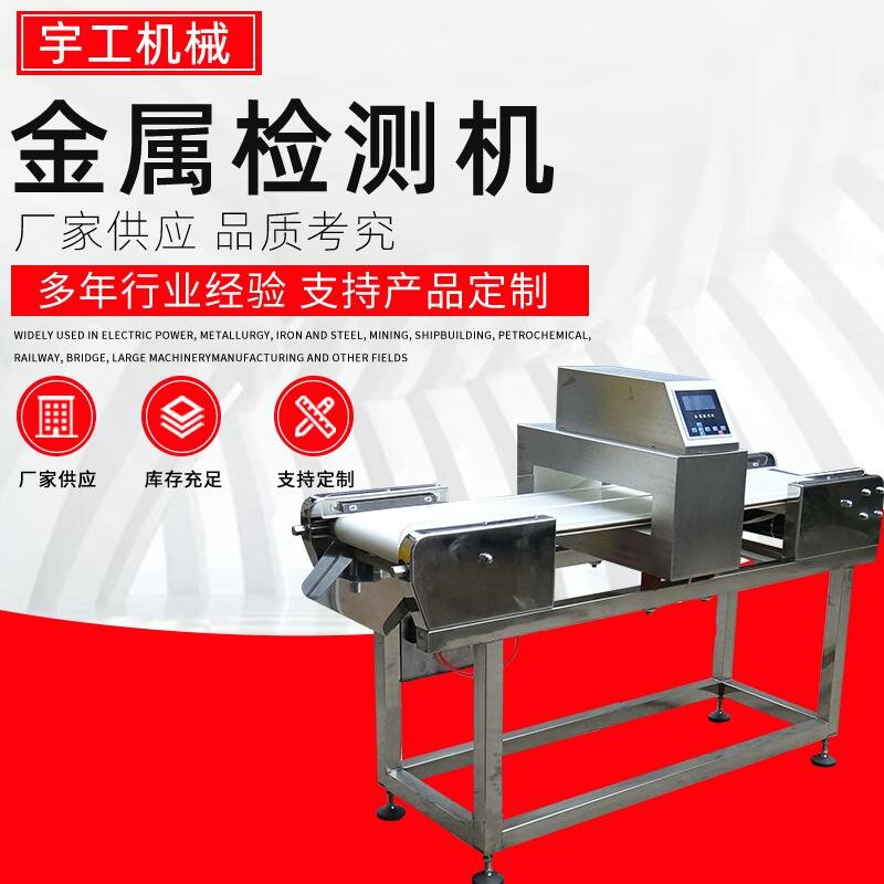该设备由金属检测头、物料输送架、气动翻板等组成。物料经输送带一旦进入检测头,信号灯亮、鸣叫警报同时发出,气动翻板开始翻转,带有金属的物料落入下面存放箱中。